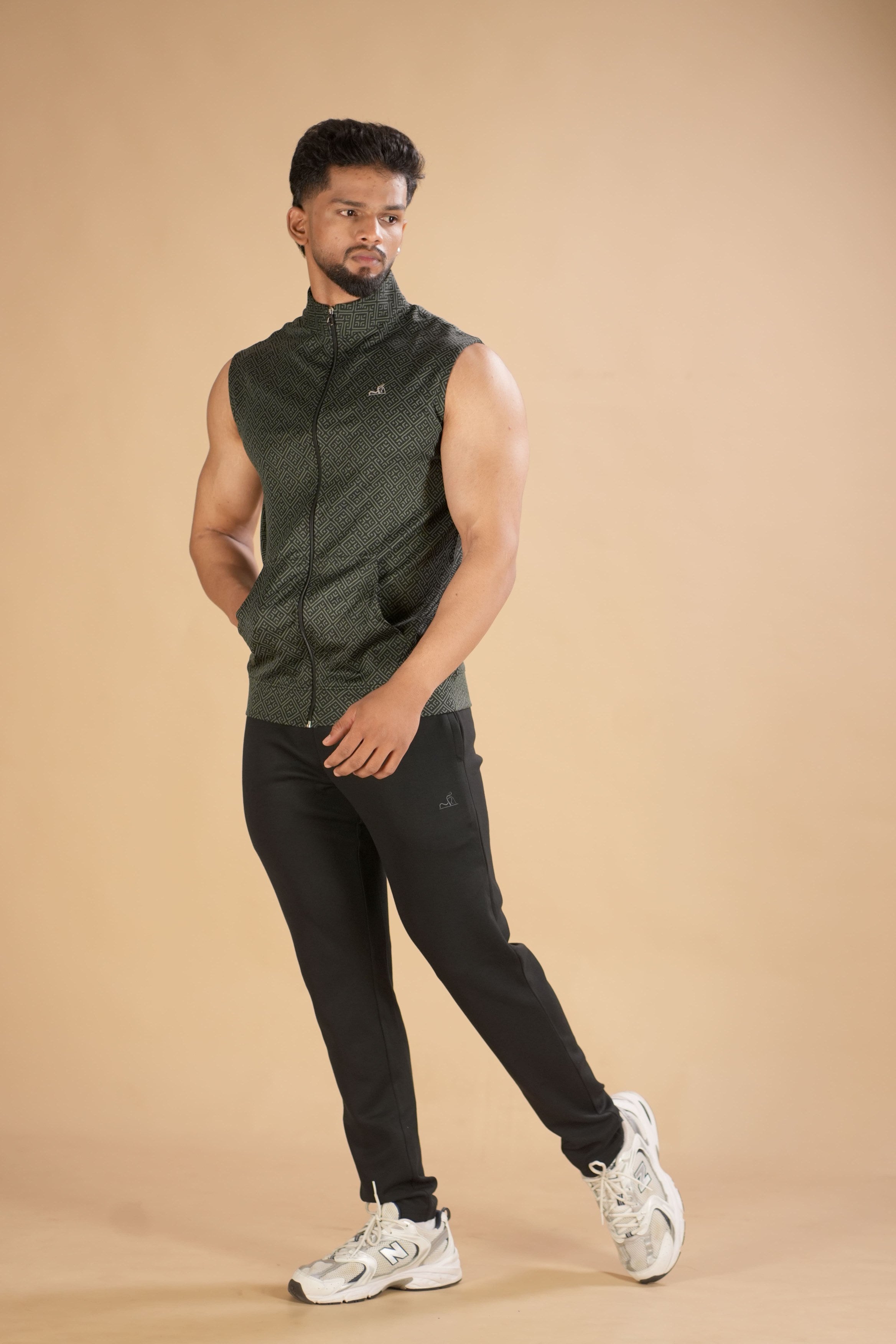 Detailed pattern work featuring a structured high-neck collar and zip closure