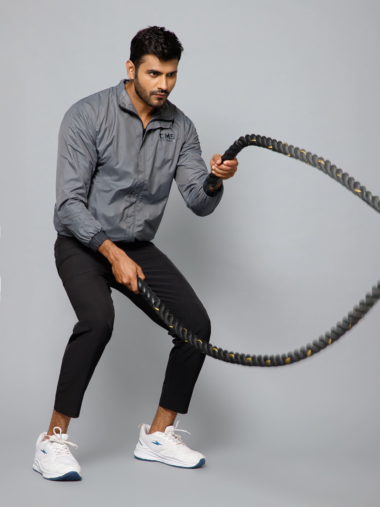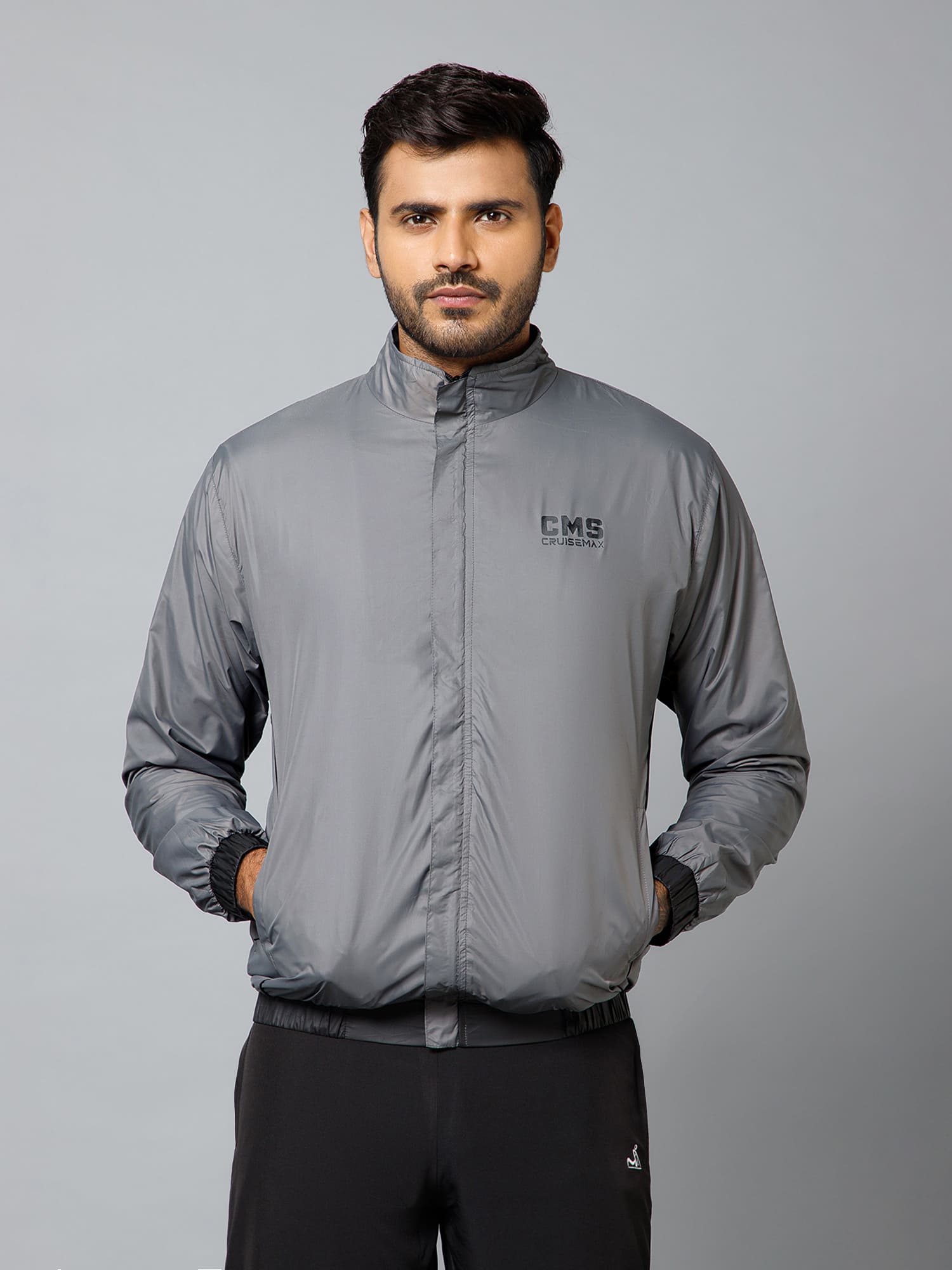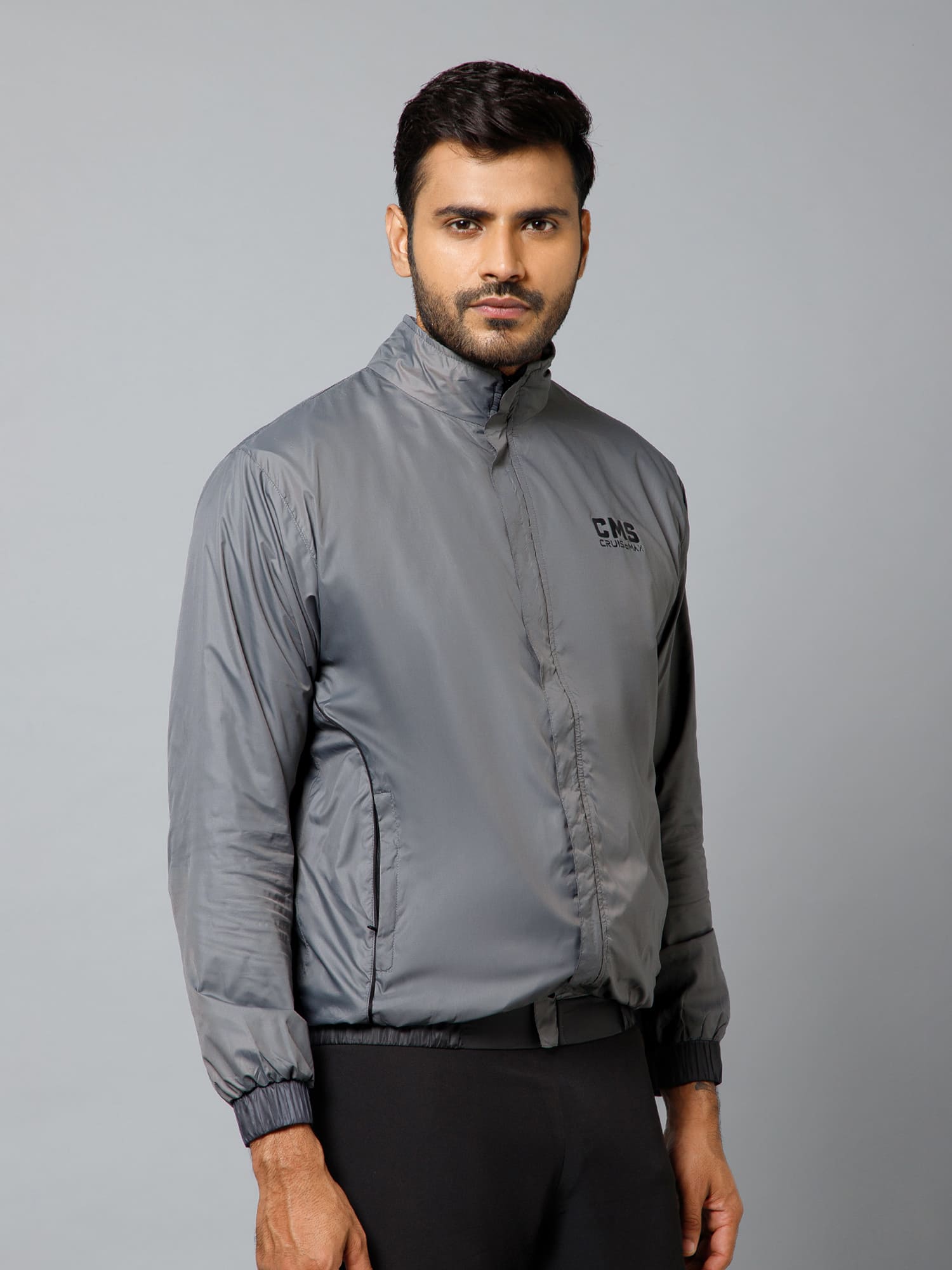 • High-neck collar, full front covered zipper, elastic cuffs, and elastic details at hem.